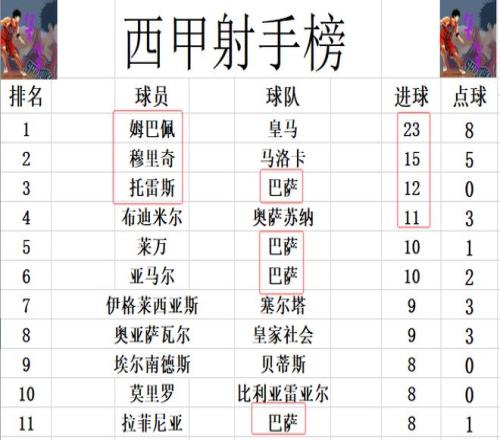 射手榜方面,姆巴佩補時打入一球后,23球繼續(xù)穩(wěn)居榜首,領(lǐng)先第2的穆里奇多達(dá)8球,比第2的托雷斯更是多了11球。萊萬,亞馬爾10球并列第5。拉菲尼亞,莫里羅和埃爾南德斯8球剛好擠入前十。