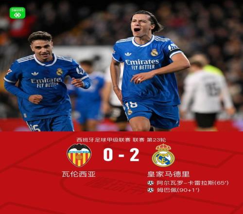 北京時間2月9日西班牙足球甲級聯(lián)賽 聯(lián)賽 第23輪,瓦倫西亞主場對陣皇家馬德里?;始荫R德里阿爾瓦羅-卡雷拉斯破門,姆巴佩破門。最終比分瓦倫西亞 0-2 皇馬。