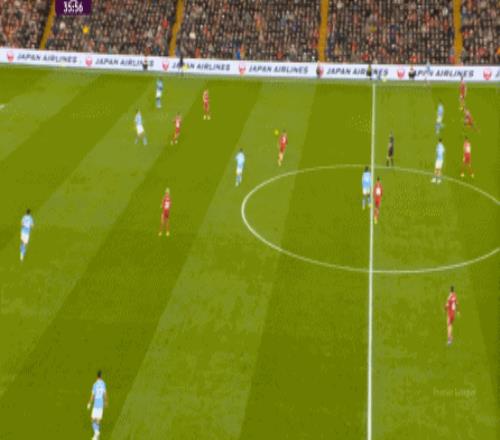 當(dāng)然了,利物浦的進(jìn)攻威脅程度和曼城還是沒(méi)法比,薩拉赫的確不負(fù)當(dāng)年之勇,但埃基蒂克和維爾茨也沒(méi)有什么像樣的表現(xiàn),所以曼城很快重新掌握大局,在第33分鐘,用利物浦的失誤和自身的跑位,帶著維爾茨的羅德里在右路送出了傳中: