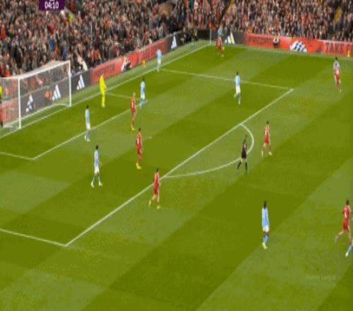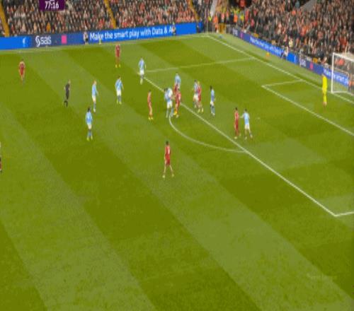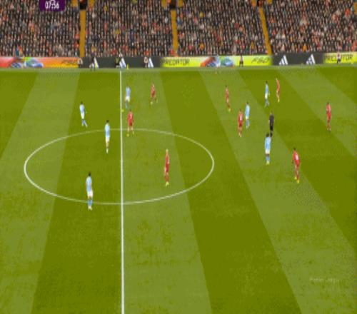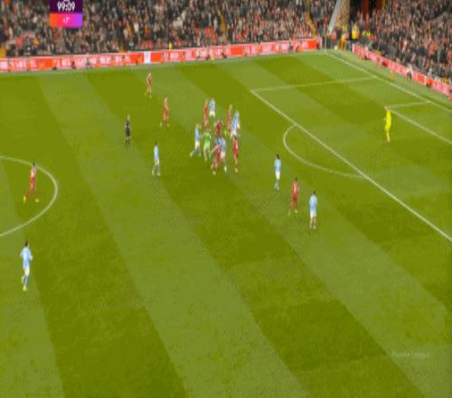 這在戰(zhàn)術(shù)上不會(huì)有特別明顯的變化,所以曼城的表現(xiàn)并未立刻改善,于是在第73分鐘,利物浦在由左至右的轉(zhuǎn)移過(guò)程中打出進(jìn)攻,隨后在二點(diǎn)爭(zhēng)奪中制造了定位球: