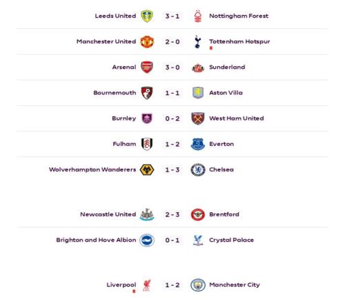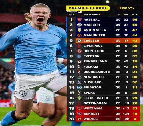 北京時間2月9日凌晨,隨著本輪焦點戰(zhàn)利物浦主場遭曼城絕殺,英超第25輪十場比賽全部戰(zhàn)罷。阿森納3比0完勝桑德蘭,繼續(xù)6分領(lǐng)跑英超;曼城憑借哈蘭德93分鐘的制勝點球2比1力克利物浦,坐穩(wěn)次席,領(lǐng)先本輪打出平局的維拉3分;曼聯(lián)2比0擊敗熱刺,繼續(xù)排名第四,距離維拉3分;切爾西3比1擊敗狼隊,領(lǐng)先本輪輸球的利物浦4分,兩隊分列第五、第六。