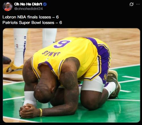 美媒發(fā)推寫(xiě)道:“詹姆斯總決賽失利次數(shù)6次,愛(ài)國(guó)者超級(jí)碗失利次數(shù)6次?!?/p>