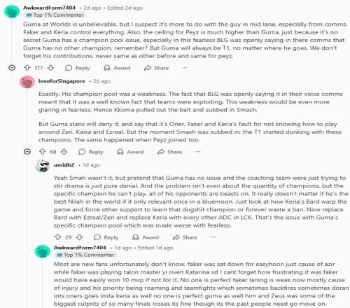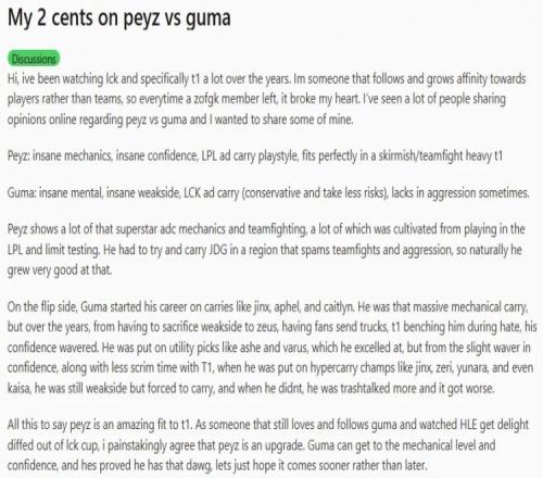 嗨,這些年來我一直在關(guān)注LCK,尤其是T1。我是一個(gè)更傾向于關(guān)注選手而非戰(zhàn)隊(duì)的人,所以每次有ZOFGK的成員離開,我都會(huì)感到心碎。我看到網(wǎng)上有很多關(guān)于Peyz和Guma的討論,我也想分享一些我的看法。