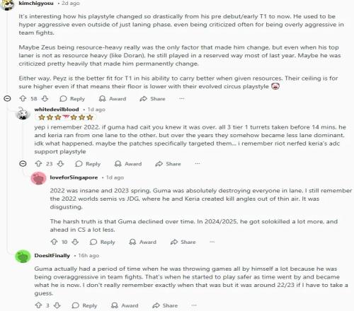 2022年和2023年春季賽簡直瘋狂。Guma在對(duì)線期簡直是把所有人吊起來打。我還記得2022年世界賽半決賽打JDG,他和Keria簡直是憑空創(chuàng)造擊殺機(jī)會(huì)。太離譜了。殘酷的事實(shí)是Guma隨著時(shí)間推移確實(shí)下滑了。在2024/2025年,他被線殺的次數(shù)變多了,補(bǔ)刀領(lǐng)先的情況也變少了。