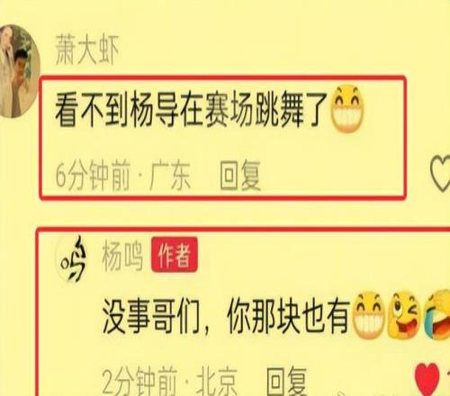 但是,對于故意挑事的,楊鳴也絕對不會慣著。比如說有網(wǎng)友很明顯是帶著冷嘲熱諷的腔調(diào)給他留言說:“再也看不到楊導(dǎo)在賽場跳舞了”,楊鳴也是毫不客氣地予以了回應(yīng),他說“沒事哥們,你那塊也有?!痹趺礃??給力不?
