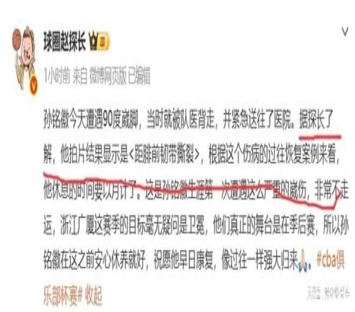 當(dāng)然,真正糟糕的是,在比賽開場不久后,廣廈的核心后衛(wèi)孫銘徽便意外受傷。根據(jù)現(xiàn)場畫面來看,孫銘徽是在一次突破中,誤踩了迪亞洛的腳,意外崴腳。在談到這一次崴腳時,孫銘徽毫不避諱的表示,這是他職業(yè)崴腳最嚴(yán)重的一次。隨后,他被隊友背著離開賽場。賽后,根據(jù)知情人士透露,孫銘徽這一次傷到了距腓前韌帶撕裂,將會缺席接下來的比賽。而對于孫銘徽會缺席多久,根據(jù)該知情人士透露,孫銘徽此次傷停,恐怕會以月計。