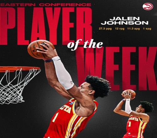 過去一周,約翰遜場均27.3分12.0籃板11.3助攻,幫助老鷹打出2勝1負的戰(zhàn)績。