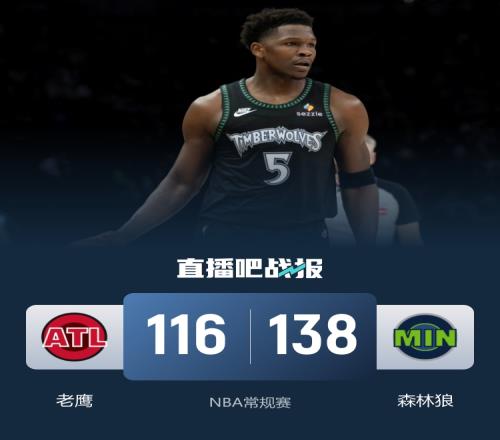 比賽開始,雙方上來就在外線展開對飆,愛德華茲帶隊建立主動權(quán),麥科勒姆狀態(tài)火熱力里突外投幾乎彈無虛發(fā)單節(jié)轟下16分回應,首節(jié)森林狼領(lǐng)先7分,次節(jié)雙方繼續(xù)對攻,森林狼突然下起三分雨,連續(xù)5記三分14-0攻擊波直接領(lǐng)先到近30分。下半場,雙方圍繞著二十幾分分差繼續(xù)拉鋸戰(zhàn),蘭代爾和蓋耶連續(xù)內(nèi)線取分,老鷹三節(jié)追到19分,末節(jié)老鷹還在追分,麥科勒姆連續(xù)罰球單節(jié)再上雙,但森林狼多點開花保持雙位數(shù)領(lǐng)先,最終森林狼138-116擊退老鷹。