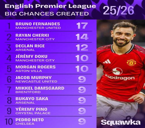 英超創(chuàng)造重大機(jī)會(huì)榜:B費(fèi)17次領(lǐng)跑,謝爾基14次、賴斯12次