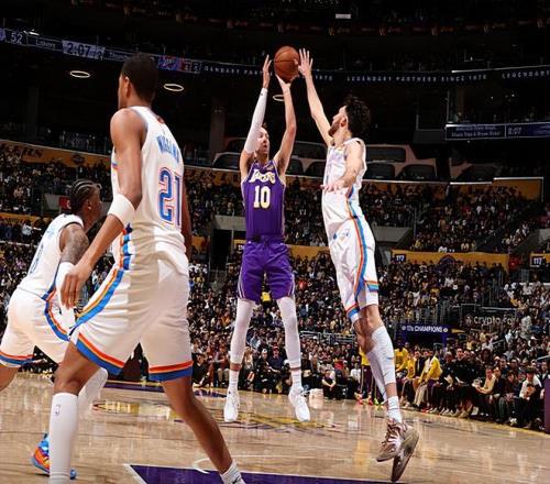 本場比賽中,在交易截止日前剛剛從亞特蘭大老鷹加盟湖人的替補(bǔ)后場新援盧克-肯納德(Luke Kennard)的表現(xiàn)還算是中規(guī)中矩。肯納德全場出場24分13秒,投籃5中3,三分線外2中1,得到了7分1籃板1助攻1搶斷的數(shù)據(jù),還有4次犯規(guī),正負(fù)值為-7。其實(shí)從表現(xiàn)來看,肯納德的整體狀態(tài)還是不錯(cuò)的,他在進(jìn)攻端還是展現(xiàn)出了自己全面的得分能力,他的手感看起來也是不錯(cuò)的。問題就在于,肯納德完全沒有辦法得到更多的出手機(jī)會(huì),這種情況下他在進(jìn)攻端的威力,特別是他的投射能力,也沒有辦法發(fā)揮出來。肯納德本來就是一名攻強(qiáng)于守的球員,指望他在其他方面起到更大的作用顯然也是一件不太現(xiàn)實(shí)的事情。很顯然,湖人還是沒有開發(fā)出肯納德的最大價(jià)值,他的功能并沒有體現(xiàn)出來。