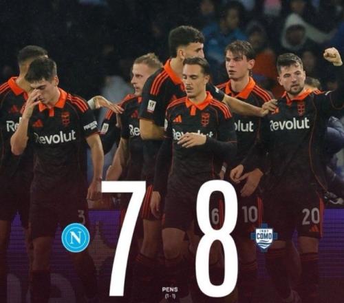 那不勒斯第2名主罰的球員盧卡庫罰丟了,而科莫第4名主罰的佩羅內也罰丟。5輪下來雙方都罰丟1球,只能繼續(xù)加罰。最終直到第8輪才決出勝負。洛博特卡罰丟,他罰出的點球被撲了出去,非常無奈。最終,那不勒斯以7-8的總比分慘遭淘汰出局。法布雷加斯率領科莫挺進半決賽,目標直指冠軍!