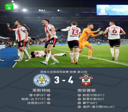 北京時間2月11日,英格蘭足球冠軍聯(lián)賽第32輪,萊斯特城主場對陣南安普頓。比賽中,萊斯特城憑借穆卡薩、帕森-達(dá)卡和法塔武的進(jìn)球取得3-0領(lǐng)先。此后場上風(fēng)云突變,南安普頓依靠斯圖爾特、斯蒂芬斯、曼寧和謝伊-查爾斯的進(jìn)球讓三追四神奇逆轉(zhuǎn)。最終,南安普頓4-3萊斯特城。
