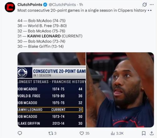 連續(xù)32場(chǎng)20+快船隊(duì)史第三!小卡刷紀(jì)錄吞里程悲在場(chǎng)16被迫打卡