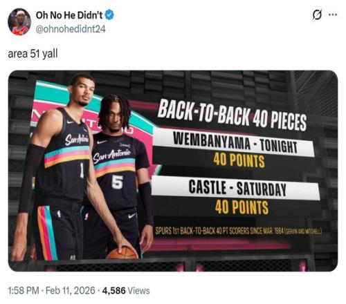 這也是文班生涯第二次在30分鐘內(nèi)砍下40+,追平哈登、恩比德、杰倫布朗并列歷史第三,僅次于克萊4次與庫里5次。