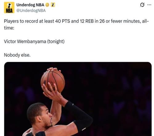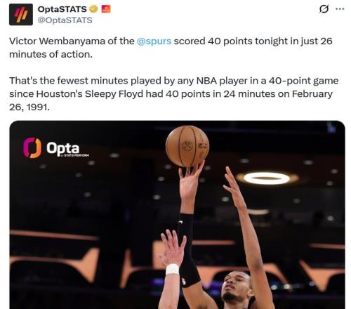 他還僅花費26分零6秒,也讓文班亞馬成為NBA近35年單場拿到40+得分用時最短的球員。