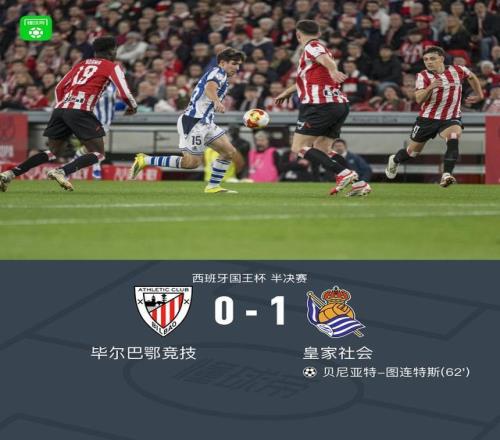北京時間2月12日西班牙國王杯 半決賽,畢爾巴鄂競技對陣皇家社會。上半場,兩隊均無建樹。下半場,馬林門前一米補射中柱。隨后,圖連特斯打破僵局。全場比賽結(jié)束,皇家社會客場1-0擊敗畢爾巴鄂,在兩回合比賽中占得先機。