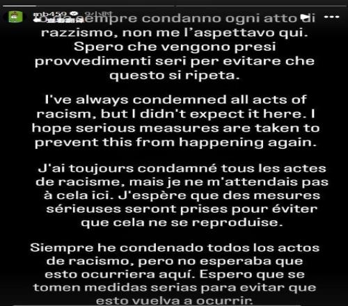 巴洛特利表示,他在對陣迪拜城的比賽中遭遇了種族歧視:“今天,在一場比賽中,我多次成為種族歧視侮辱的對象,有人多次對我說:‘嗚嗚嗚,去吃香蕉吧’。在足球或社會中,絕對沒有種族歧視的容身之地。”