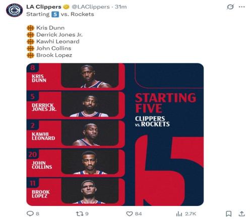 快船:鄧恩、瓊斯、萊昂納德、科林斯、洛佩斯;