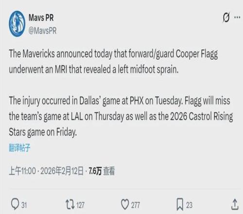北京時間2月12日中午,達(dá)拉斯獨行俠官方宣布:庫珀-弗拉格接受了核磁共振檢查,結(jié)果顯示左腳中部扭傷。弗拉格將缺席明天獨行俠和湖人的常規(guī)賽,同時退出2月14日開打的NBA新秀賽。這對NBA聯(lián)盟來說,無疑是重大打擊。