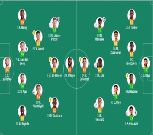 阿森納首發(fā):1-拉亞、3-莫斯克拉、5-因卡皮耶(81'33-卡拉菲奧里)、6-加布里埃爾、12-廷伯、10-埃澤(46'8-厄德高)、36-蘇維門迪、41-賴斯、14-約克雷斯、19-特羅薩德(81'11-馬丁內(nèi)利)、20-馬杜埃凱(70'7-薩卡)