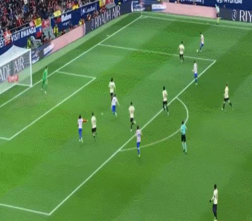 來到第33分鐘,朱利亞諾-西蒙尼右路傳球,阿爾瓦雷斯不停球橫傳,盧克曼跟進(jìn)得分,馬競3-0了!