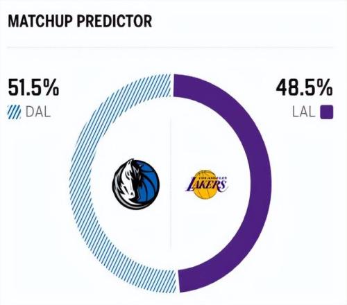 賽前,美媒ESPN對本場比賽進行了勝率預(yù)測,湖人隊勝率意外僅有48.5% ,有點低了,獨行俠勝率則高達51.5% 。