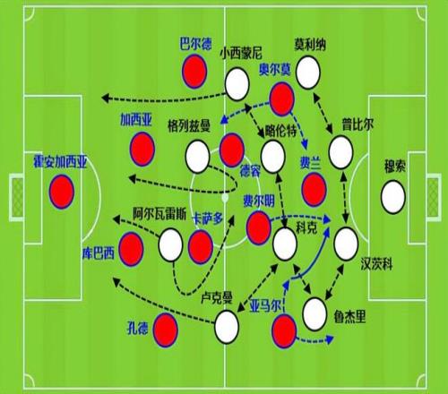 馬競(jìng)做得最好的一點(diǎn),就是通過(guò)后場(chǎng)直接長(zhǎng)傳找邊路,打出兩翼齊飛后增加肋部的前插,弗里克會(huì)要求巴薩球員快速擠壓向一側(cè),但馬競(jìng)又會(huì)轉(zhuǎn)移球打另外一側(cè),兩邊都能起速,最終就把巴薩的防線撕碎了。