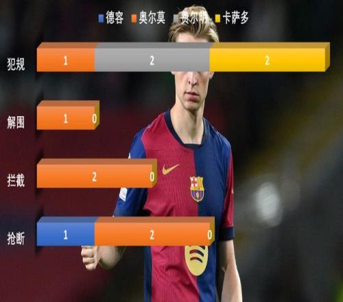 從防守?cái)?shù)據(jù)上也可以看到,巴薩的4名先發(fā)中場(chǎng)(奧爾莫是先發(fā)左邊鋒,上半場(chǎng)后段改打德容身側(cè)的另外一個(gè)后腰)里,德容僅有1次搶斷,攔截解圍和犯規(guī)都是0,費(fèi)爾明和卡薩多更是只有2次犯規(guī)。