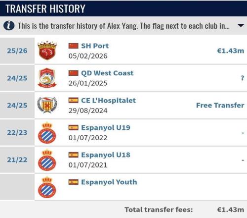 他曾隨西班牙人U14A隊(duì)奪得加泰羅尼亞聯(lián)賽冠軍,在地中海杯等賽事中擔(dān)任主力,擁有純正歐洲足球青訓(xùn)背景。2024年8月,楊希轉(zhuǎn)投半職業(yè)的西協(xié)丙聯(lián)賽球隊(duì)奧斯皮塔萊特,24-25賽季坐板凳0出場(chǎng)。