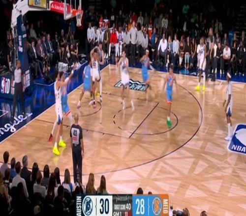 不過楊瀚森并沒有讓大家等太久,比分9-14的時候,楊瀚森被替換上場。這比賽是打分?jǐn)?shù)的,不計時間,誰先到40分誰贏。在楊瀚森上場前,克林根大殺四方,在14分里拿到9分。
