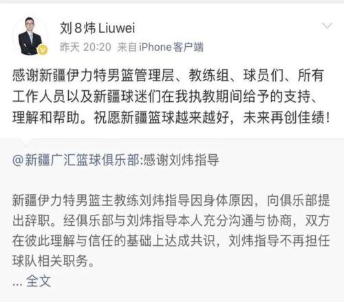 2月13日,新疆廣匯籃球俱樂部通過微博發(fā)布公告,稱主教練劉煒因身體原因辭職,不再擔(dān)任球隊相關(guān)職務(wù)。