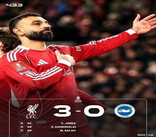 足總杯第4輪,利物浦主場(chǎng)3-0擊敗布萊頓,晉級(jí)16強(qiáng)。加克波打進(jìn)一球,但是越位在先,凱爾凱茲助攻瓊斯破門。索博斯洛伊擴(kuò)大領(lǐng)先優(yōu)勢(shì),薩拉赫造點(diǎn)并親自主罰命中。