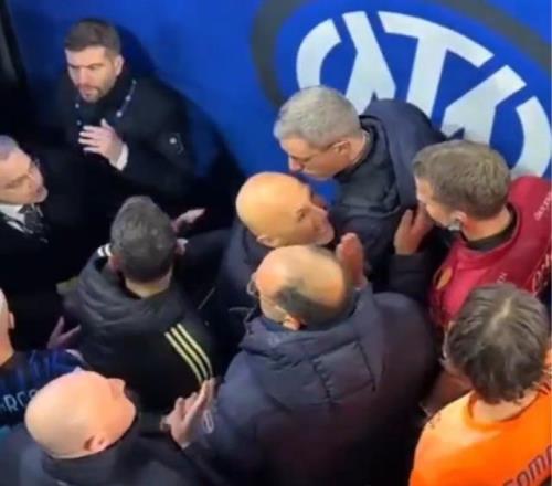 這段視頻其實拍攝于上半場結(jié)束時,起因是卡盧盧被裁判出示了第二張黃牌從而被罰下,這一爭議判罰直接導致了“三巨頭”在球員通道內(nèi)的爆發(fā)。根據(jù)媒體的透露,當時斯帕萊蒂喊的是:“比賽被毀掉了,比賽被毀掉了。”而基耶利尼則反復強調(diào):“紅牌不存在!紅牌不存在!”