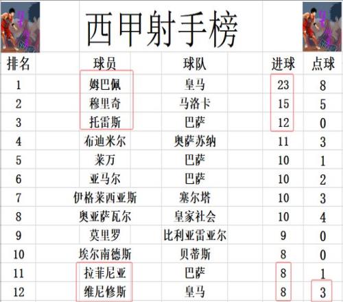 射手榜方面,姆巴佩缺陣,還是23球領(lǐng)跑,穆里奇15球位列第2,托雷斯12球排在第3。維尼修斯今天無緣帽子戲法,但是點(diǎn)射梅開二度后,他追上了拉菲尼亞和埃爾南德斯,8球剛好擠入前十。