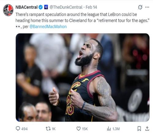 一天之前,ESPN記者布蘭德-麥克馬洪在播客節(jié)目中透露,聯(lián)盟內(nèi)部廣泛猜測勒布朗-詹姆斯會在今夏重返克利夫蘭騎士隊,開啟一段‘史詩級的退役巡演’,但這些內(nèi)幕還在推測階段并沒有官方確切的消息。