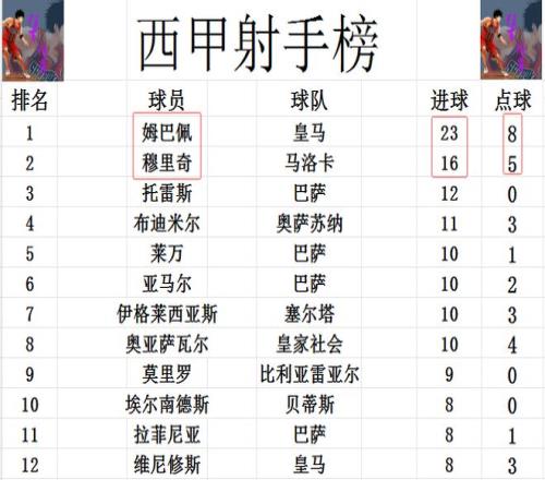 射手榜方面,姆巴佩23球繼續(xù)領(lǐng)跑,穆里奇今天打入一球,將和姆巴佩的差距縮小到7球。第3的托雷斯落后姆巴佩就有點(diǎn)多了,差了11球之多。埃爾南德斯,拉菲尼亞和維尼修斯8球剛好擠入前十。