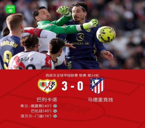 北京時間2月15日西班牙足球甲級聯(lián)賽 聯(lián)賽 第24輪,巴列卡諾主場對陣馬德里競技。巴列卡諾弗蘭-佩雷斯破門,巴倫廷破門,諾貝爾-門迪破門。最終比分巴列卡諾 3-0 馬競。