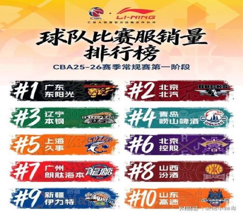而球隊(duì)球衣前十排名依次是:廣東,北京,遼寧,青島,上海,北控,廣州,山西,新疆和山東。