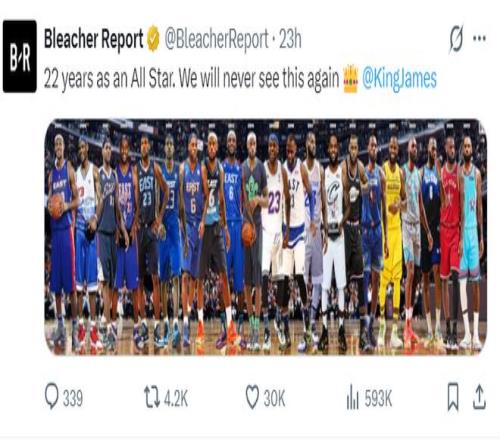 美媒BR寫道:連續(xù)22年入選全明星,這樣的球員以后不會再有了。