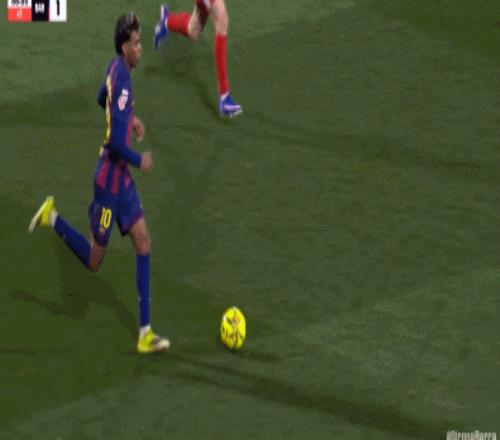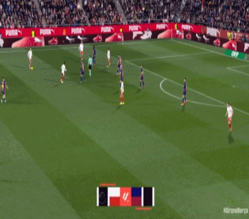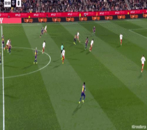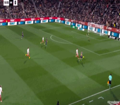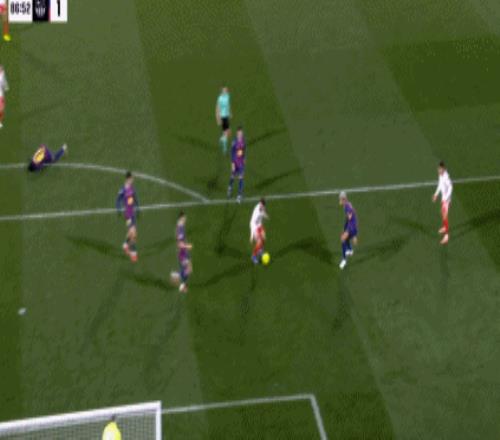第34分鐘,拉菲尼亞直塞,費爾明小角度打門踢飛