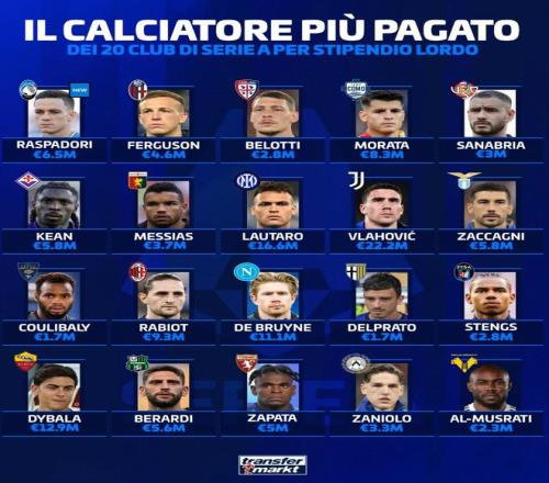 北京時間2月17日,德轉統計出了本賽季意甲20家俱樂部各自隊內的頂薪球員,其中尤文圖斯前鋒弗拉霍維奇以稅前2220萬歐元的年薪位居意甲第一,勞塔羅1660萬歐元第二,迪巴拉1290萬歐元第三。