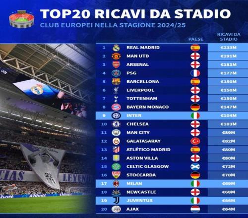 德轉(zhuǎn)統(tǒng)計2024-25賽季歐洲俱樂部球場門票收入TOP20: