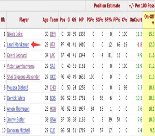 on-off值也就是在場與離場百回合正負值的差值,這項數(shù)據(jù)足以證明此位球員在他所在球隊中的重要性。