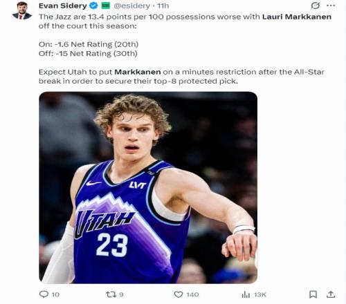 因為馬卡的個人發(fā)揮對球隊影響過大,預(yù)計爵士隊在全明星周末后會限制他的登場時間,以確保爵士隊在2026年拿到前八順位。