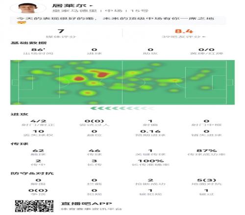 居萊爾本場(chǎng)4射2正+1關(guān)鍵傳球5對(duì)抗3成功+2搶斷3長(zhǎng)傳獲評(píng)7分
