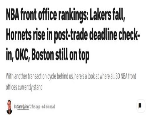 常規(guī)賽過(guò)半進(jìn)入全明星周末之際,美媒《CBS》根據(jù)本賽季前半程最新表現(xiàn)重新評(píng)價(jià)NBA各隊(duì)管理層水平排名,其中雷霆隊(duì)毫無(wú)疑問(wèn)高居第一,陷入困境的火箭隊(duì)仍高居第3,勇士隊(duì)17名,湖人僅排25位。