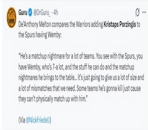 梅爾頓談到新援珀金:波爾津吉斯是很多球隊的對位噩夢,正如馬刺隊的文班亞馬一般,這兩人都是7尺多的身高,兼具尺寸與投射,我們會有大量的錯位優(yōu)勢,聯(lián)盟很多球隊根本防不住他,這就是純粹的身體天賦碾壓。