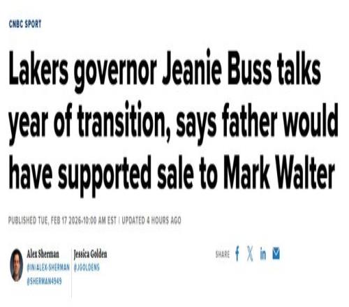 珍妮及其家族去年同意以100億美元的估值,將湖人隊多數股權出售給沃爾特。ESPN近期報道稱,巴斯家族兄妹間的嚴重分歧最終促成了這筆交易,珍妮稱這次出售“苦樂參半”。