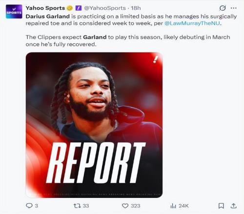 北京時間2月19日,根據快船記者勞里-穆雷的報道,達柳斯-加蘭目前還無法進行對抗訓練,他的腳趾還在康復中,他腳趾手術的傷口還沒有愈合,所以他的復出時間還需要視每日的觀察而定,預計加蘭最快也要三月份傷愈后首次登場。