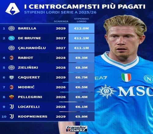 北京時間2月20日,德轉(zhuǎn)統(tǒng)計出了本賽季意甲稅前年薪最高的10名中場球員,巴雷拉以1200萬歐元排名第一,德布勞內(nèi)和恰爾汗奧盧同以1110萬歐元并列第二位。